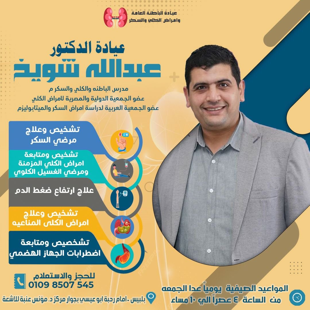 يُعدّ د. عبدالله محمود شويخ من الأطباء المتميزين في مجال أمراض الباطنة والكلى والسكر، بخبرة أكاديمية وعملية تجمع بين الدقة العلمية والرعاية الإنسانية. يتخصص في تشخيص وعلاج أمراض الجهاز الهضمي، ارتفاع ضغط الدم، أمراض الكلى المزمنة، ومضاعفات مرض السكري، مع اهتمام خاص بمتابعة الحالات المزمنة ووضع الخطط العلاجية المناسبة لكل مريض. يحرص د. عبدالله شويخ على تقديم خدمة طبية متكاملة تعتمد على أحدث التقنيات والفحوصات الدقيقة لضمان أفضل النتائج وتحسين جودة حياة المرضى.