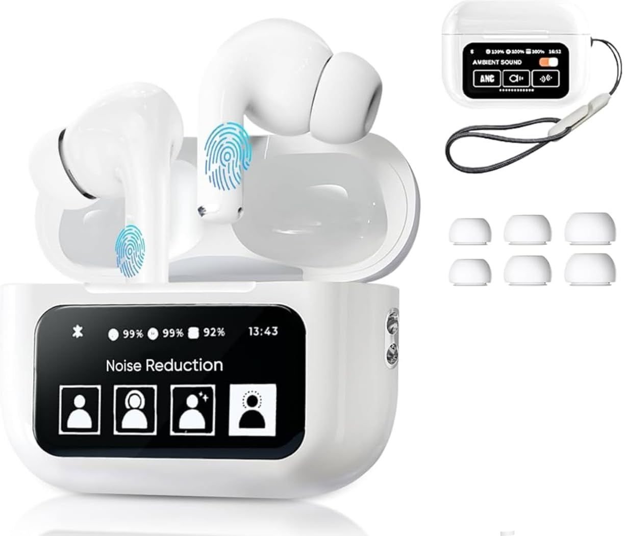مزودة بجلد إضافي للحماية وكابل شحن، وتعرض الشاشة نسبة البطارية لكل سماعة وعلبة الشحن لمتابعة الطاقة بسهولة.